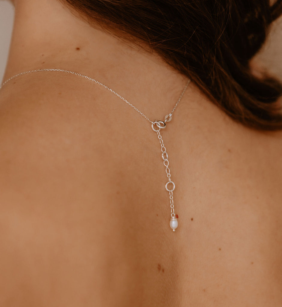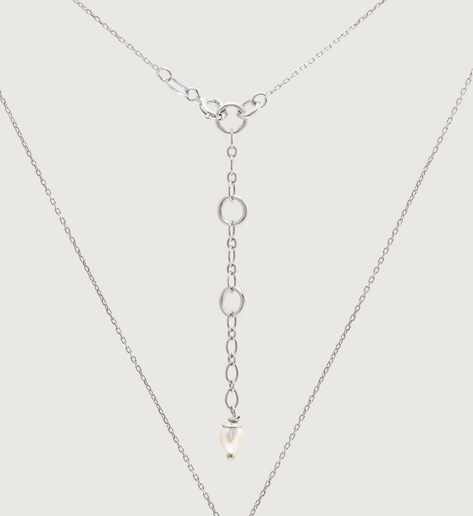 Ķēdītes kaklarota veidota no dabīgām saldūdens pērlēm, nenoslīpēta melnā dimanta un 925 proves sudraba, kas ir antialerģisks un piemērots jutīgai ādai.